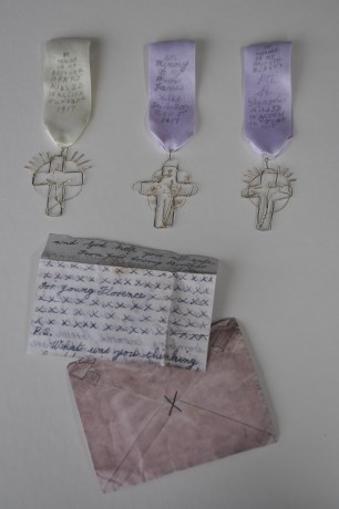 Our The work is about personal loss of loved ones and the family as a casualty of war. ‘Our’ is inspired by the artist’s family mementos from the First World War, which consist of medals, photographs, newspaper cuttings, memorial ribbons and some drawings from a small note book. The drawings of headstones were done by Mary Dearden who was aged 17 when three of her brothers died in the Great War. Only one of the brothers has a known grave. Robert Dearden is commemorated on the Thiepval Memorial, France. Henry Dearden is commemorated at Ypres on the Menin Gate Memorial, Belgium. James Dearden Is buried at Duchy Farm New British Cemetery, Belgium. Letter from James Dearden: The letter was sent home during the Second World War. James Dearden was the son of Henry (above), he died aged 30 on 18th August 1943. He was a Prisoner of War and died constructing the Burma railway. He is buried at Thanbyuzayat War Cemetery, Myanmar (Burma).