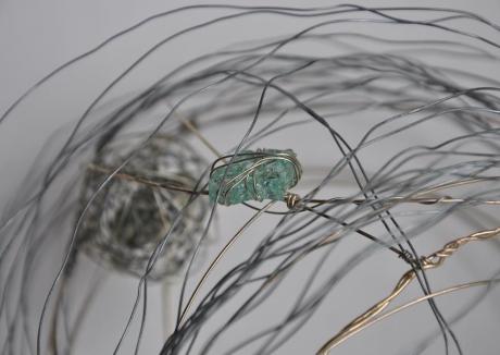 Title: Restore Description: wire, found objects Dimensions: H: 160mm x W: 165mm x D:200mm Date made: March 2016 Free form wire encircles a void. Five small objects; a piece of glass, a shell with a hole, a pebble and a flat stone with a hole, are encased and secured inside the structure. Two of the objects are bound with wire, two of them are enclosed in their own wire sphere and the small stone has a piece of wire through it. The work is about restoration of order.