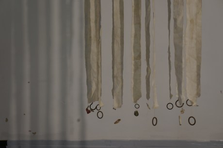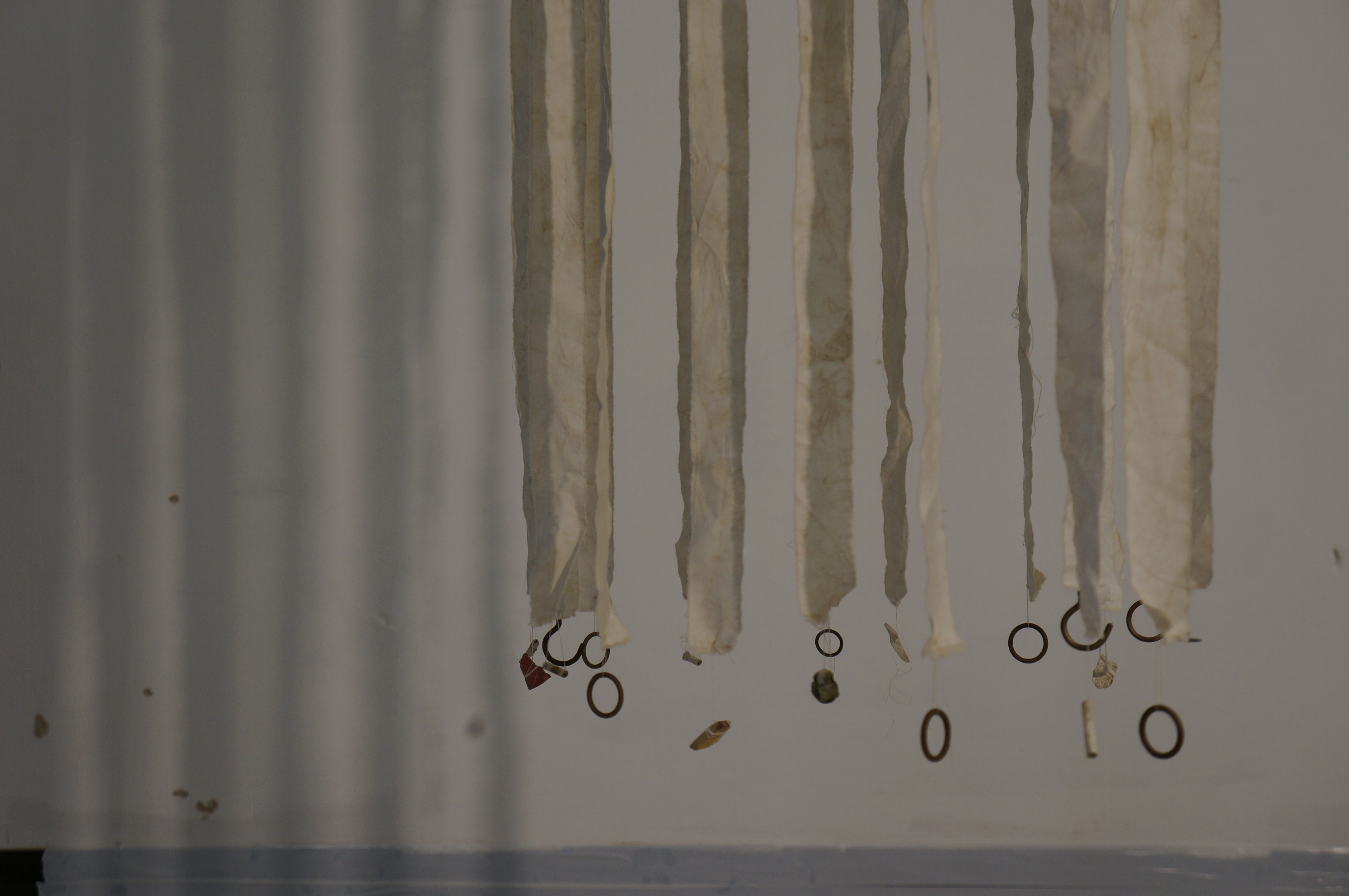 Installation, Participate Contemporary Art Space, Shropshire UK Cotton, broken clay pipes and pottery pieces and map. 1 metres x 1 metres x 2 metres April 2015
