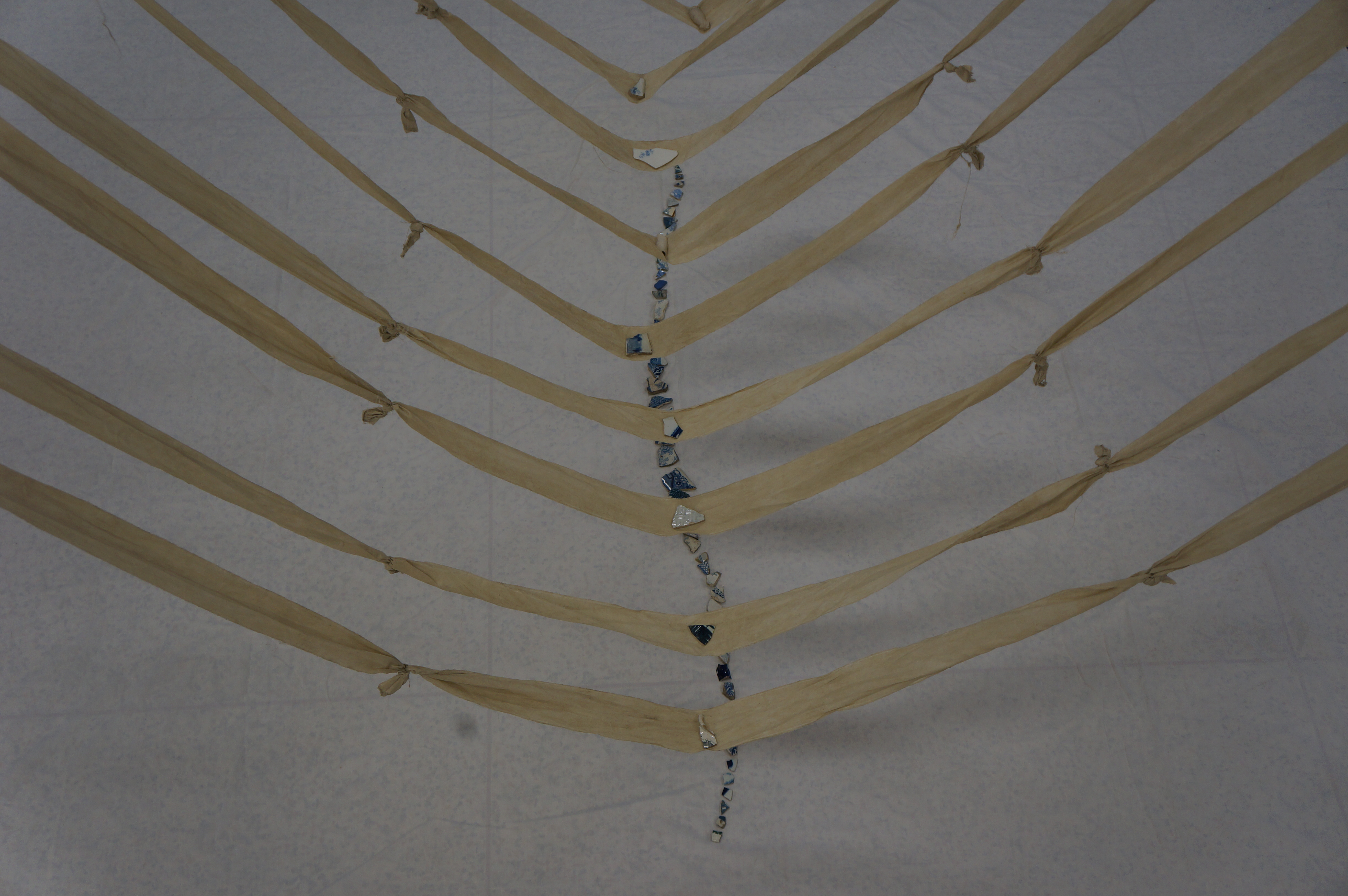 Installation, Participate Contemporary Art Space, Shropshire UK Cotton, broken clay pipes and pottery pieces and map. 5 m x 5 m x 5 m April 2015