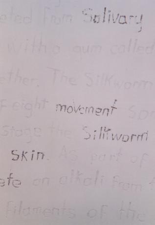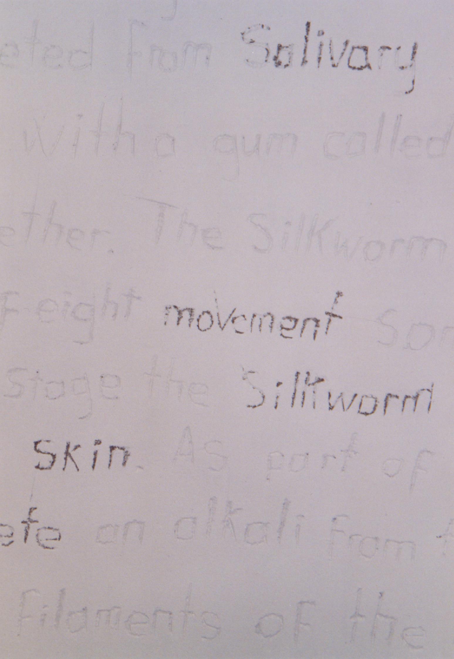 ‘Silkworms’ is a site sensitive installation, developed from the contrast between a small rural woodland of silver birch trees, where I like to escape to, near my home in Newport Shropshire, and a study of the inner city area of Whitmore Reans in Wolverhampton. The textile ‘worms’ made from silk are suspended within the space as if they are floating. Across two sides of the room text is carved into the wall describing the life cycle of a silkworm. The use of silk relates to our historic relationship with nature, the making of silk goes back thousands or years. Cultivated silkworms have evolved to rely on humans for their survival. The work was shown in 2003 in the School of Art at The University of Wolverhampton as part of my MA Show, the building is in site of the area of Whitmore Reans.